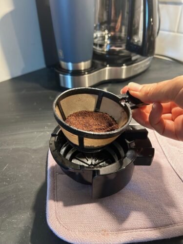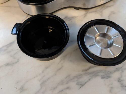 The full carafe side is much like any basic drip-coffee maker. There’s a small reservoir that holds enough water to brew a full pot of coffee. There’s a flip lid and a basket for coffee grounds. You can use paper filters or buy a separate metallic, re-usable mesh filter that fits inside this basket. I like these baskets as it’s less wasteful than using paper filters daily and I don’t have to remember to constantly purchase filters. I’ve used the same mesh filter for over 7 years now. It doesn’t filter as finely as paper filters do and the last sip of coffee contains a small amount of grit / sediment but this seems normal to me now. If someone doesn’t like this idea than I would warn them not to drink the last sip. It’s pretty easy to avoid.