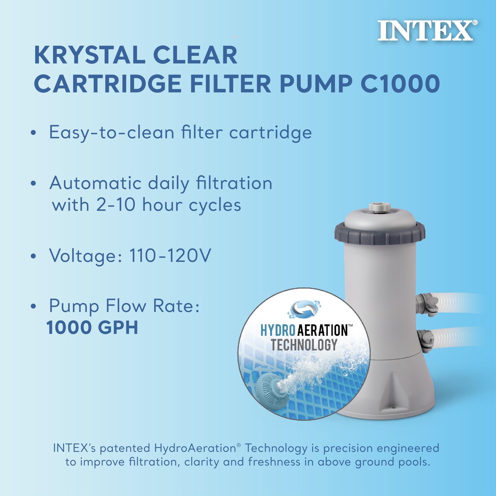 • Replace the Pump that comes with it with the Intex C1,000 Pump. The pump included is woefully under powered. The C1,000 circulates more water per hour (3x’s faster than what’s included) so you don’t have run it as much.