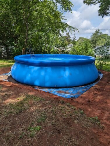 The most crucial aspect of setting up this pool is ensuring that the ground is level. It took three days for my husband, a friend, and me to get it properly leveled, especially when dealing with our rugged NC devil’s dirt. I learned that it’s essential to pay attention to the water flow when filling the pool – if the water is consistently flowing to one side, it’s a sign that thee pool is not level. Ignoring this could cause the pool to lean to one side when filled, as shown in the pictures.