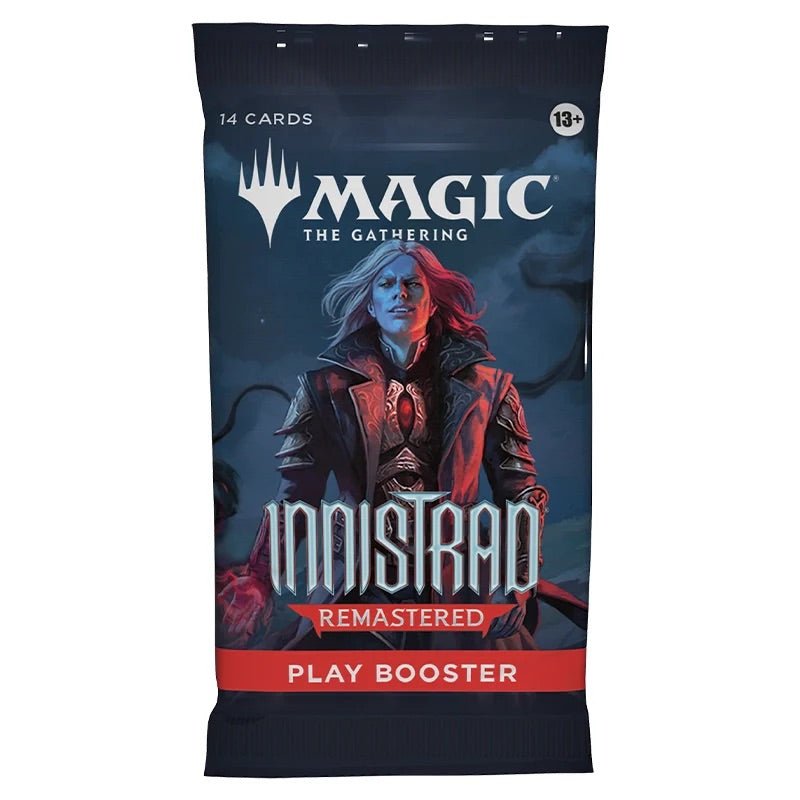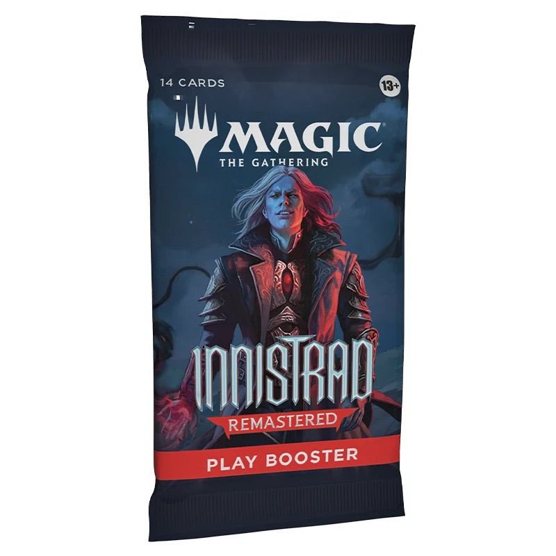 Sink your teeth into the very best of Magic’s spookiest gothic horror setting and rediscover everything you love to fear. This Innistrad Remastered Play Booster contains 14 Magic: The Gathering cards and 1 Token/Ad card, Helper card or Art card, including 1-4 cards of rarity Rare or higher and 3-6 Uncommon, 6-9 Common and 1 Land cards. Each Play Booster arrives nostalgia-packed with a Retro frame card and1  card of any rarity is Traditional Foil. Foil Borderless Mythic Planeswalker in <1% of boosters. Traditional Foil Land replaces a Land in 20% of boosters.