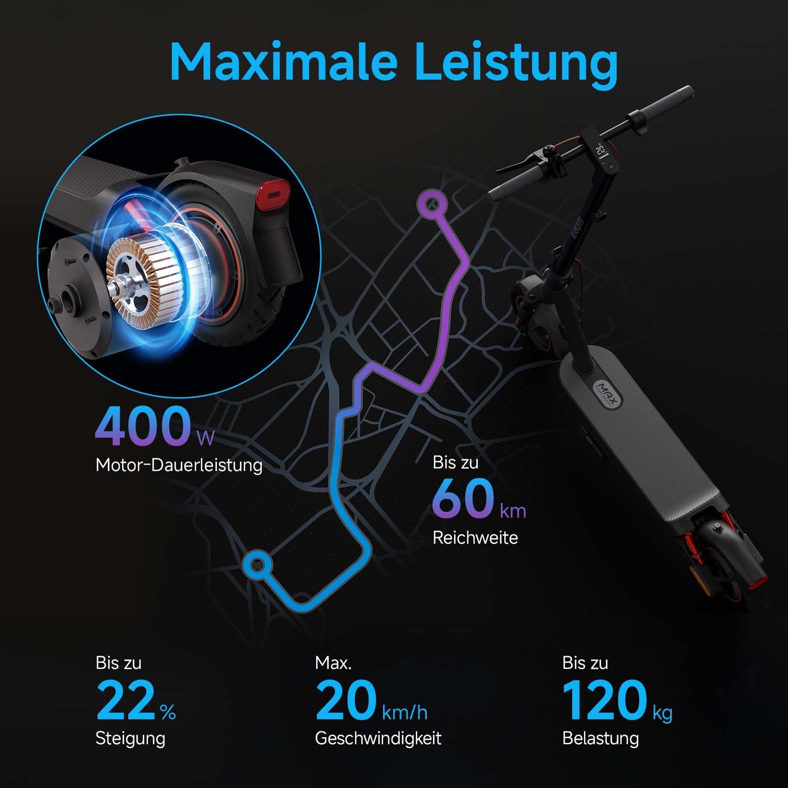 Im direkten Vergleich zum Vorgängermodell 4 Pro merkt man die Weiterentwicklung deutlich – Beschleunigung und Federung wurden spürbar verbessert. Für kurze Arbeitswege oder als Ergänzung zu Bus und Bahn ist dieser Scooter ideal. Praktisch: Der kleine Haken am Lenker eignet sich hervorragend, um Einkaufstüten sicher zu transportieren.