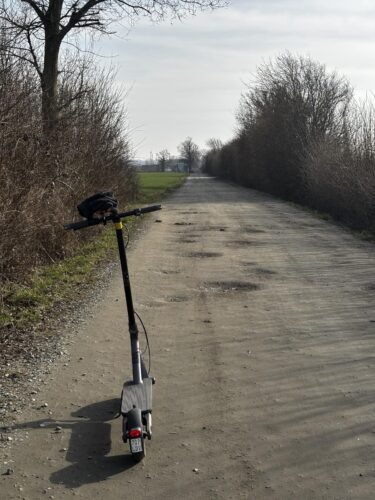 Das Beste an diesem Scooter ist natürlich die Federung. Die ist zwar wie ein Gummiball aber sehr viel besser als nichts. Reichweite ist gut, Leistung mittelmäßig, trotzdem ausreichend. Das Licht ist ziemlich gut, könnte aber etwas heller sein. Abhilfe schafft hier eine Stirnlampe, damit man mit einer Hand- und Kopfbewegung nach vorne oder schon in die nächste Kurve leuchten kann.