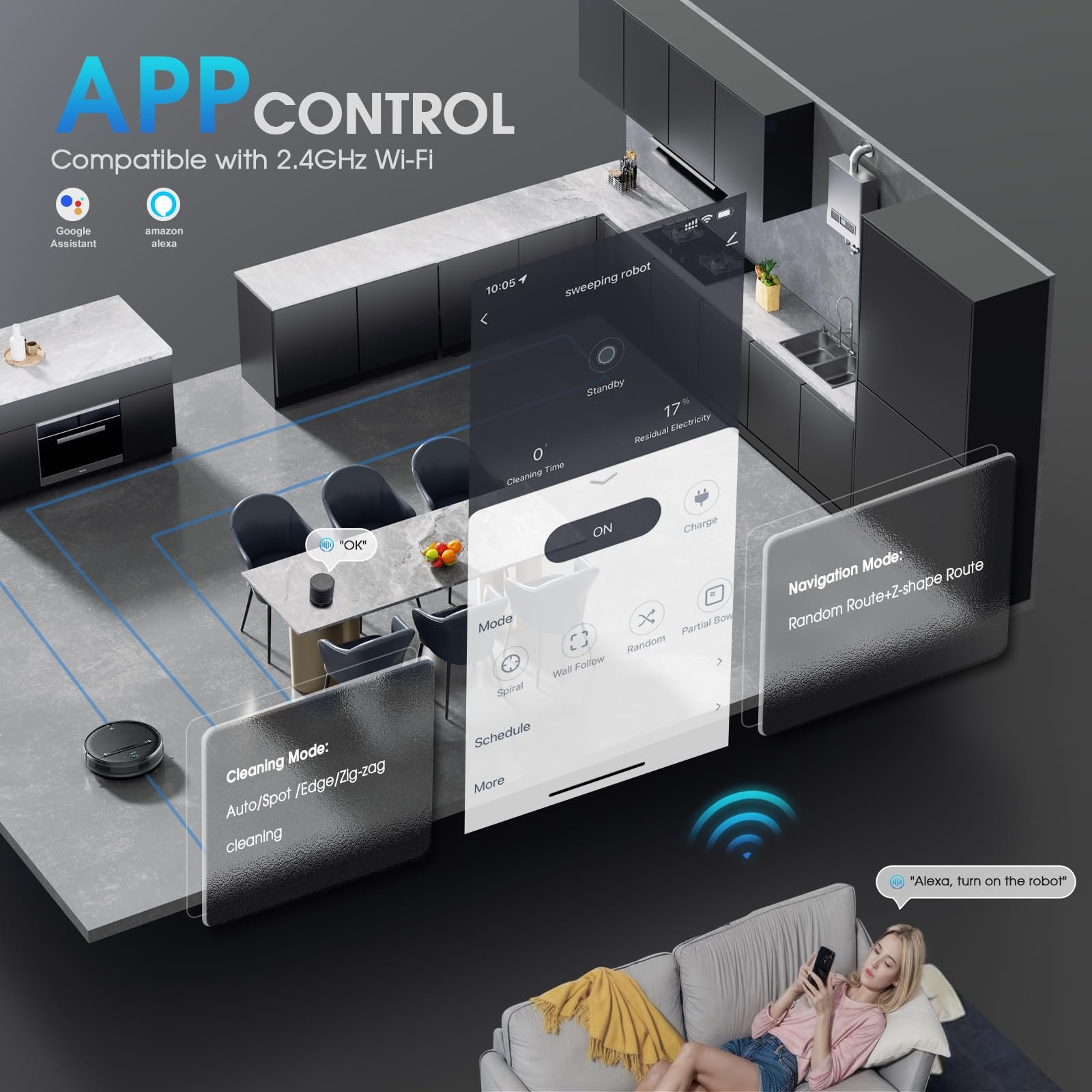 - 📱 App, Voice & Remote Control: Compatible with Alexa, Google Assistant, and the Tuya Smart App. Schedule cleanings, adjust suction levels, and manage water flow—right from your smartphone or via voice commands (2.4GHz Wi-Fi required).