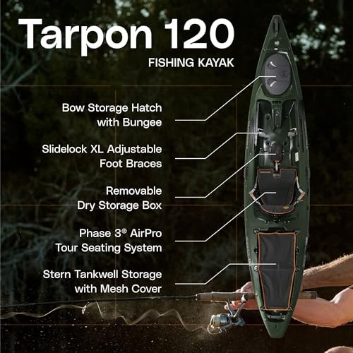 The Tarpon 120 elevates on-water performance with enhanced agility, stability, and comfort for serious anglers and paddlers. Its extended 12’3″ hull provides superior tracking and glide, allowing you to cover more water with less effort. The Phase 3 AirPro seating system—with honeycomb-vented 3D foam and breathable mesh—keeps you cool and supported throughout long days on the water. Configurable SlideTrax™ accessory rails and DryTec storage let you optimize deck layout for fishing electronics or adventure gear. A generous rear tank well carries crates, coolers, or camping supplies, making the Tarpon 120 ideal for multi-day excursions. Whether chasing lunker bass on a calm lake, navigating winding river channels, or camping along a coastal shoreline, the Tarpon 120 delivers unmatched versatility, durability, and premium angler features.